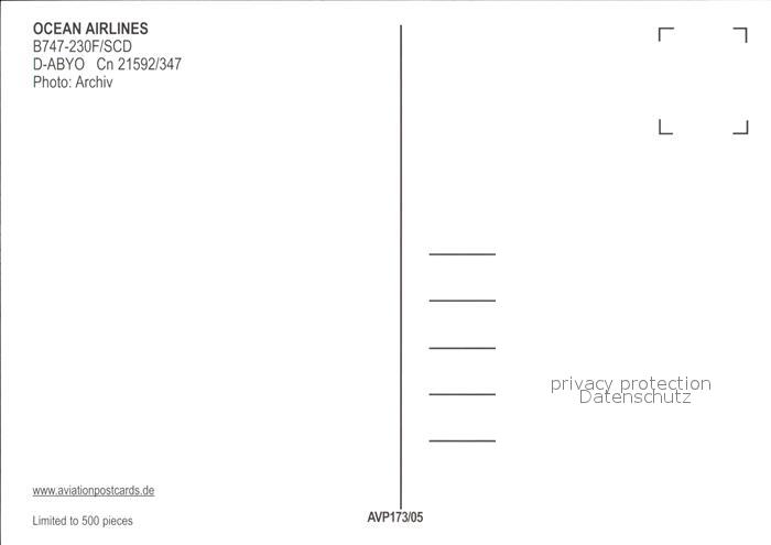 Flugzeuge Zivil Ocean Airlines B-747-230F/SCD D-ABYO Cn 21592/347 postalisch nicht gelaufen Erhaltung siehe scans
