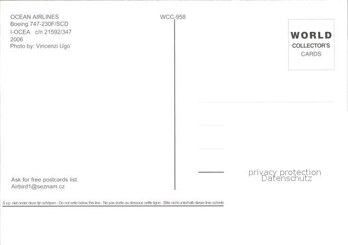 Flugzeuge Zivil Ocean Airlines Boeing 747-230F/SCD I-OCEA c/n 21592/347 postalisch nicht gelaufen Erhaltung siehe scans