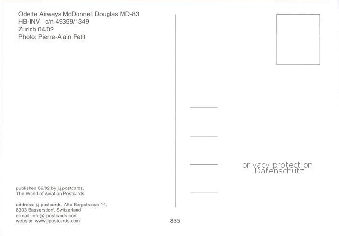 Flugzeuge Zivil Odette Airways McDonnell Douglas MD-83 HB-INV c/n 49359/1349 postalisch nicht gelaufen Erhaltung siehe scans