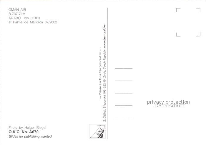 Flugzeuge Zivil Oman Air B-737-71M A40-BO c/n 33103 postalisch nicht gelaufen Erhaltung siehe scans