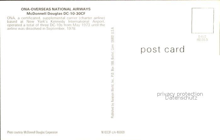 Flugzeuge Zivil ONA Overseas National Airways McDonnell Douglas DC-10-30CF N1033F c/n 46969 postalisch nicht gelaufen Erhaltung siehe scans