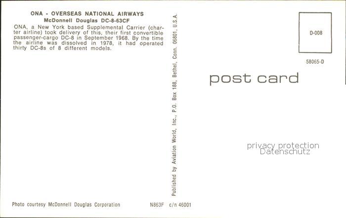 Flugzeuge Zivil ONA Overseas National Airways McDonnell Douglas DC-8-63CF N863F c/n 46001 postalisch nicht gelaufen