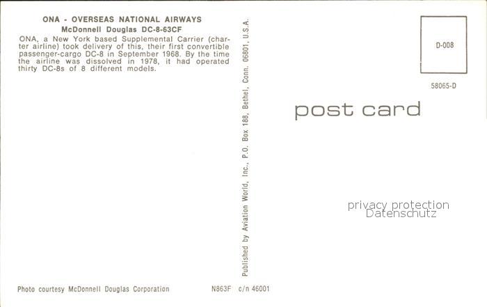 Flugzeuge Zivil ONA Overseas National Airways McDonnell Douglas DC-8-63CF N863F c/n 46001 postalisch nicht gelaufen Erhaltung siehe scans