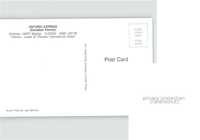 Flugzeuge Zivil Ontario Express Embraer 120RT Brazilia C-GDOE MSN 120178 postalisch nicht gelaufen Erhaltung siehe scans