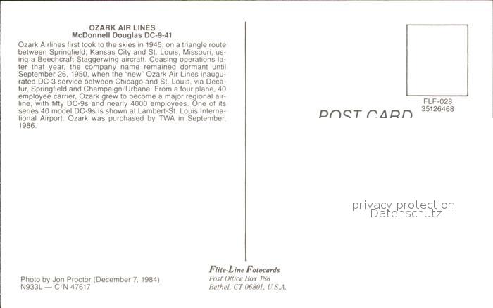 Flugzeuge Zivil Ozark Air Lines McDonnell Douglas Dc-9-41 N933L c/n 47617 postalisch nicht gelaufen Erhaltung siehe scans