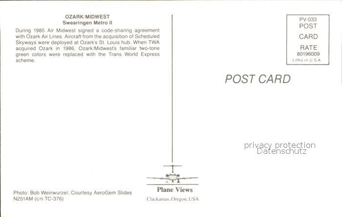 Flugzeuge Zivil Ozark Midwest Swearingen Metro II N251AM c/n TC-376 postalisch nicht gelaufen Erhaltung siehe scans
