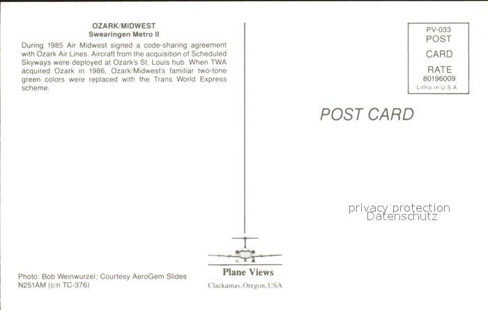 Flugzeuge Zivil Ozark Midwest Swearingen Metro II postalisch nicht gelaufen Erhaltung siehe scans
