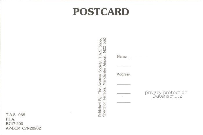Flugzeuge Zivil P.I.A. Pakistan B-747-200 AP-BCM C/N 20802 postalisch nicht gelaufen Erhaltung siehe scans