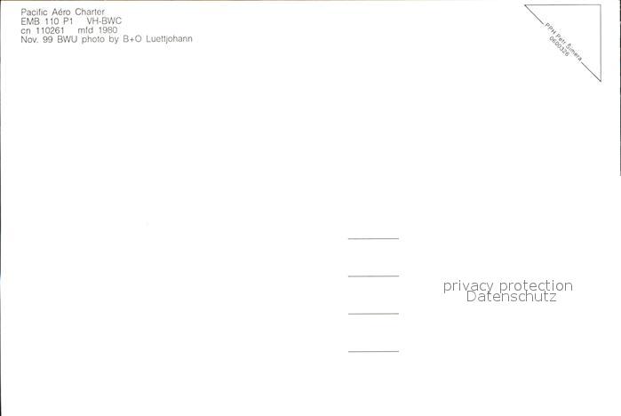Flugzeuge Zivil Pacific Aero Charter EMB 110 P1 VH-BWC cn 110261 postalisch nicht gelaufen Erhaltung siehe scans