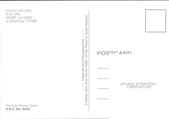 Flugzeuge Zivil Pacific Airlines B-737-2Y5 5B-DBF c/n 23040 postalisch nicht gelaufen Erhaltung siehe scans