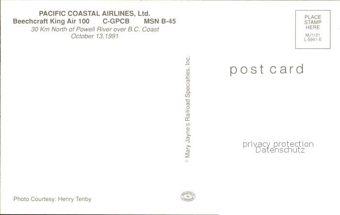 Flugzeuge Zivil Pacific Coastal Airlines Beechcraft King Air 100 C-GPCB MSN B-45 postalisch nicht gelaufen Erhaltung siehe scans