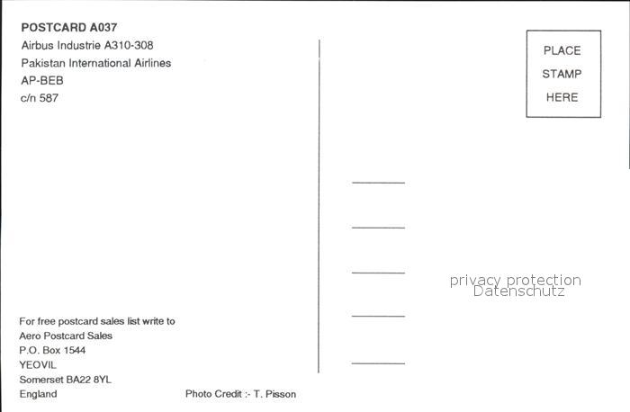 Flugzeuge Zivil Pakistan International Airlines Airbus Industrie A310-308 AP-BEB postalisch nicht gelaufen Erhaltung siehe scans
