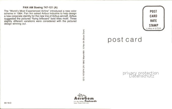 Flugzeuge Zivil Pan Am Boeing 747-121 A postalisch nicht gelaufen Erhaltung siehe scans