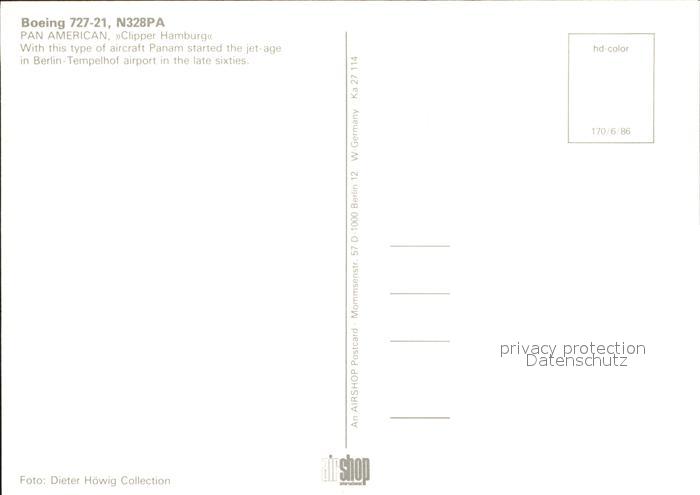 Flugzeuge Zivil Pan American Boeing 727-21 N328PA postalisch nicht gelaufen Erhaltung siehe scans