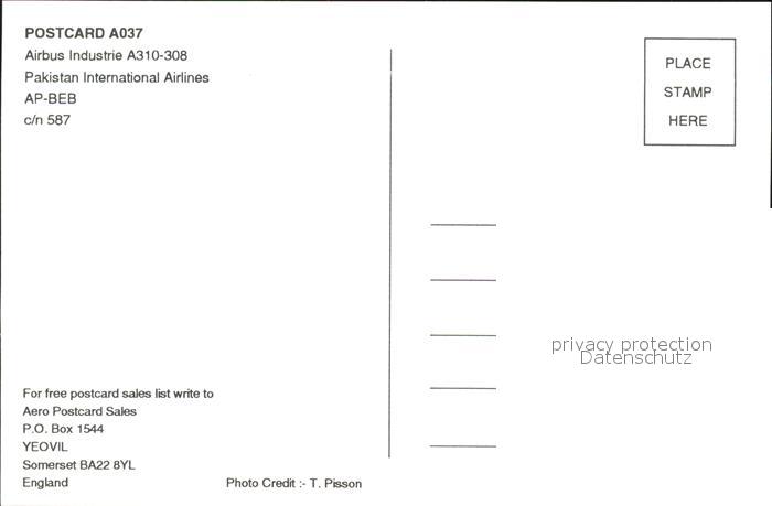 Flugzeuge Zivil PIA Pakistan International Airlines A310-308 AP-BEB c/n 587 postalisch nicht gelaufen Erhaltung siehe scans