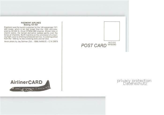 Flugzeuge Zivil Piedmont Airlines Boeing 737-401 postalisch nicht gelaufen Erhaltung siehe scans