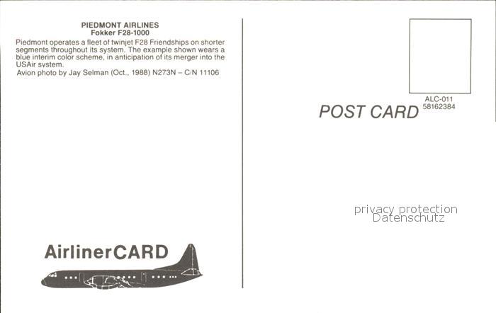 Flugzeuge Zivil Piedmont Airlines Fokker F28-1000N 273N c/n 11106 postalisch nicht gelaufen Erhaltung siehe scans