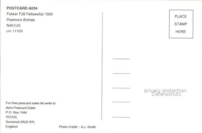 Flugzeuge Zivil Piedmont Airlines Fokker F28 Felloship 1000 N451US c/n 11103 postalisch nicht gelaufen Erhaltung siehe scans