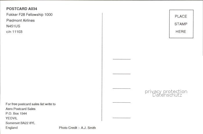Flugzeuge Zivil Piedmont Airlines Fokker F28 Fellowship 1000 N451US c/n 11103 postalisch nicht gelaufen Erhaltung siehe scans