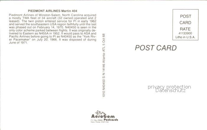 Flugzeuge Zivil Piedmont Airlines Martin 404 N40450 postalisch nicht gelaufen Erhaltung siehe scans