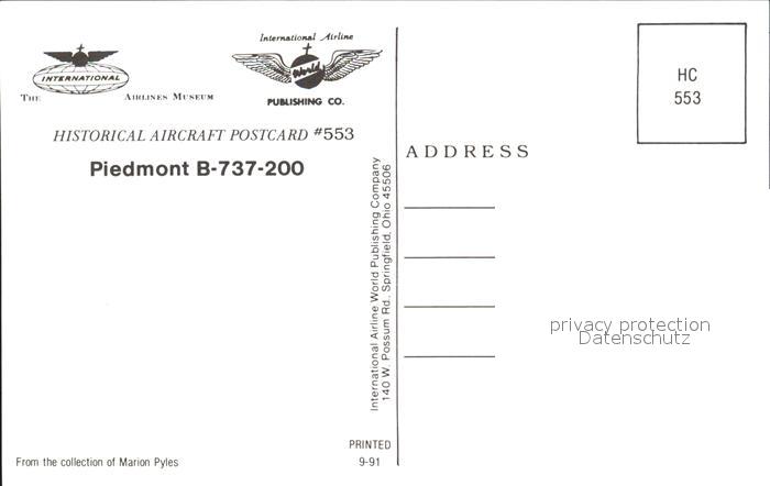 Flugzeuge Zivil Piedmont B-737-200 postalisch nicht gelaufen Erhaltung siehe scans