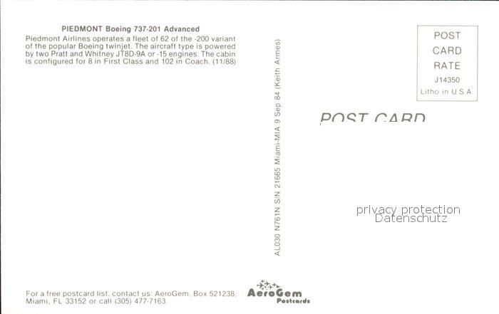 Flugzeuge Zivil Piedmont Boeing 737-201 Advanced N761N S/N 21665 postalisch nicht gelaufen Erhaltung siehe scans