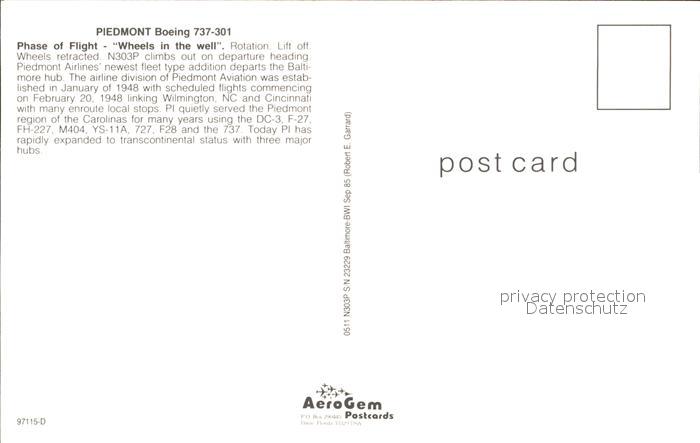Flugzeuge Zivil Piedmont Boeing 737-301 postalisch nicht gelaufen Erhaltung siehe scans