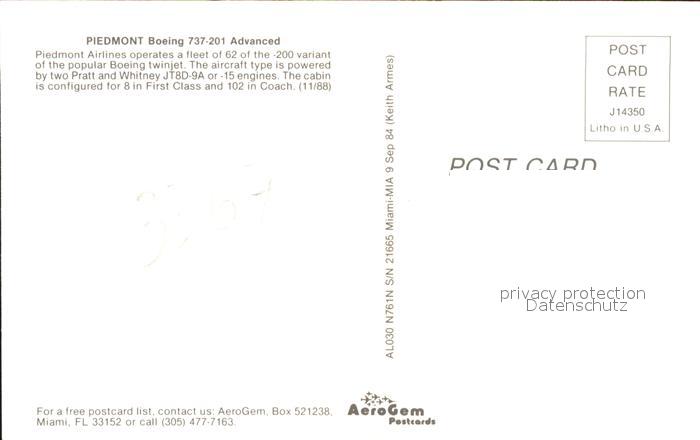 Flugzeuge Zivil PIEDMONT Boeing Advanced AL030 N761N S/N 21665 postalisch nicht gelaufen Erhaltung siehe scans