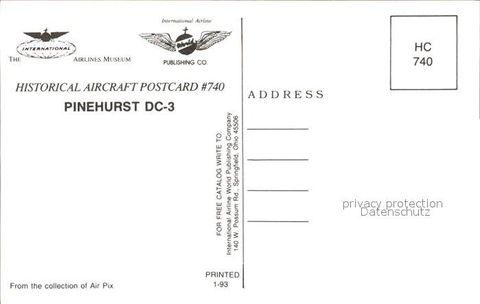 Flugzeuge Zivil Pinehurst Airlines DC-3 N6896 postalisch nicht gelaufen Erhaltung siehe scans