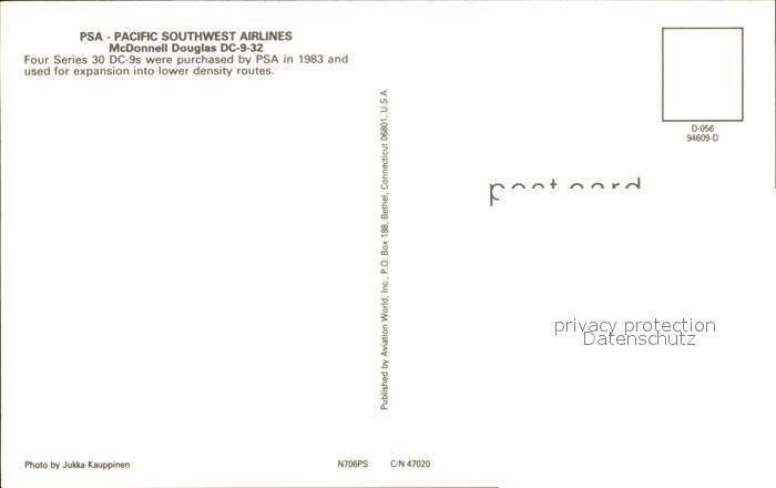 Flugzeuge Zivil PSA McDonnell Douglas DC-9-32 N706PS C/N 47020 postalisch nicht gelaufen Erhaltung siehe scans