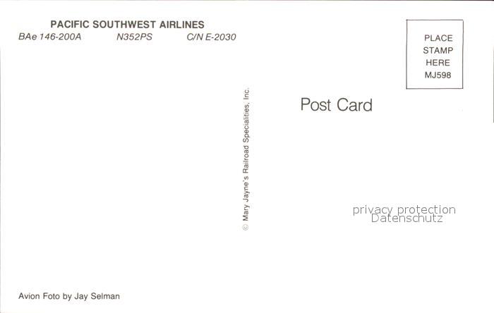 Flugzeuge Zivil PSA Pacific Southwest Airlines BAe 146-200A N352PS C/n E-2030 postalisch nicht gelaufen Erhaltung siehe scans
