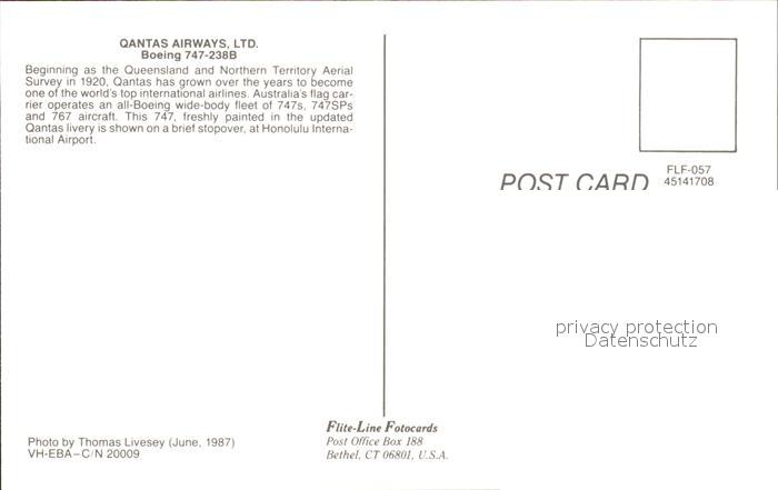 Flugzeuge Zivil Qantas Airways Boeing 747-238B VH-EBA c/n 20009 postalisch nicht gelaufen Erhaltung siehe scans