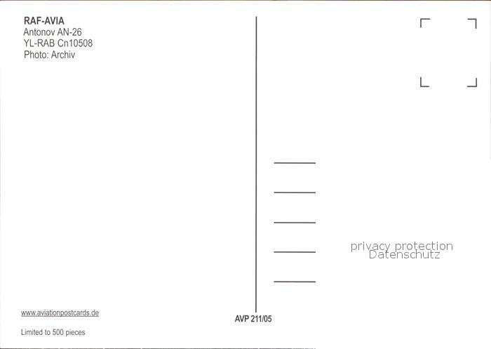 Flugzeuge Zivil RAF-Avia Antonov AN-26 YL-RAB Cn10508 postalisch nicht gelaufen Erhaltung siehe scans