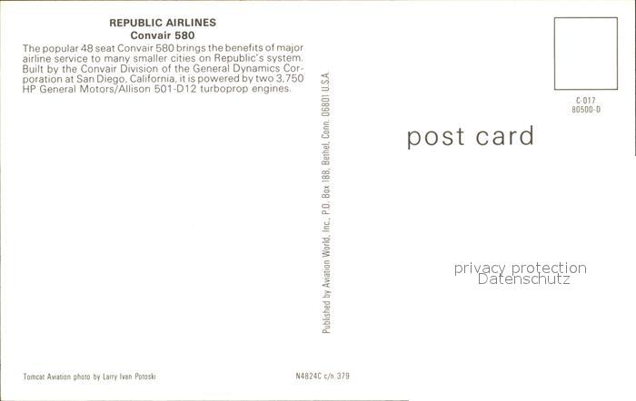 Flugzeuge Zivil Republic Airlines Convair 580 N4824C c/n 379 postalisch nicht gelaufen Erhaltung siehe scans