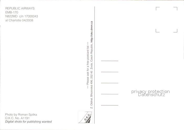 Flugzeuge Zivil Republic Airways EMB-170 N822MD c/n 17000043 postalisch nicht gelaufen Erhaltung siehe scans