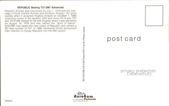 Flugzeuge Zivil Republic Boeing 727-2M7 Advanced N721RW postalisch nicht gelaufen Erhaltung siehe scans
