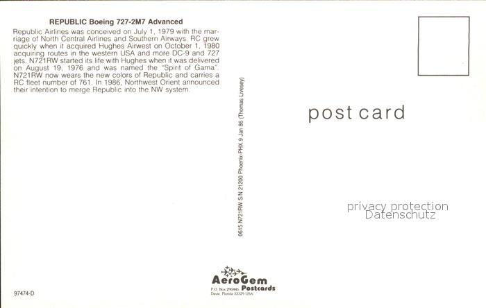 Flugzeuge Zivil Republic Boeing 727-2M7 N721RW postalisch nicht gelaufen Erhaltung siehe scans