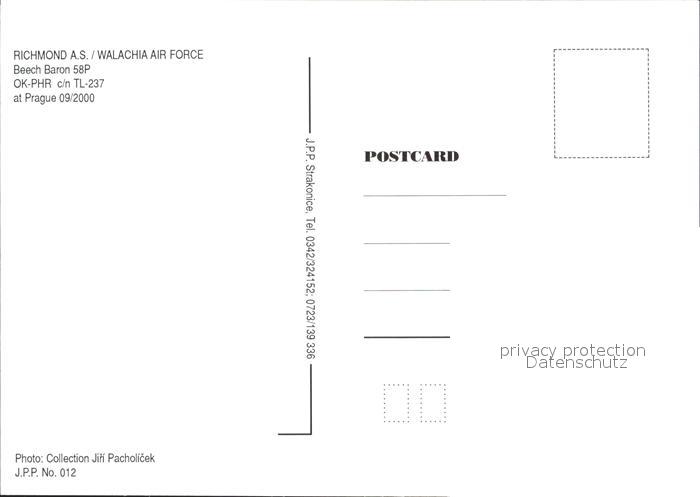 Flugzeuge Zivil Richmond A.S. Walachia Air Force Beech Baron 58P OK-PHR postalisch nicht gelaufen Erhaltung siehe scans