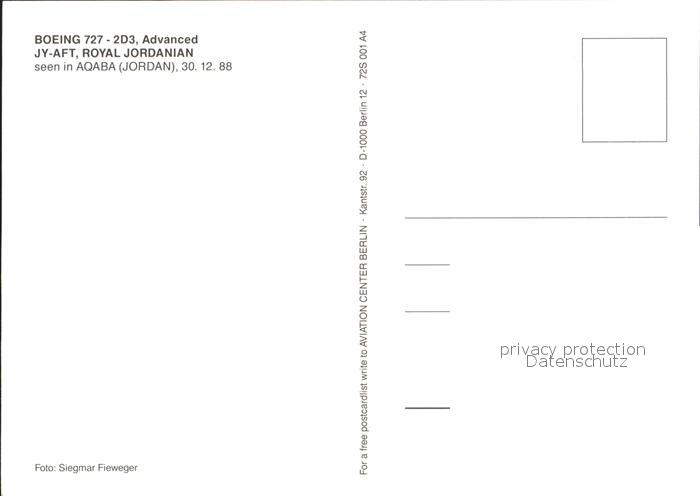 Flugzeuge Zivil Royal Jordanian Boeing 727-2D3 Advanced JY-AFT postalisch nicht gelaufen Erhaltung siehe scans