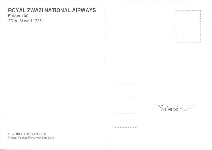 Flugzeuge Zivil Royal Zwazi National Airways Fokker 100 3D-ALM c/n 11335 postalisch nicht gelaufen Erhaltung siehe scans