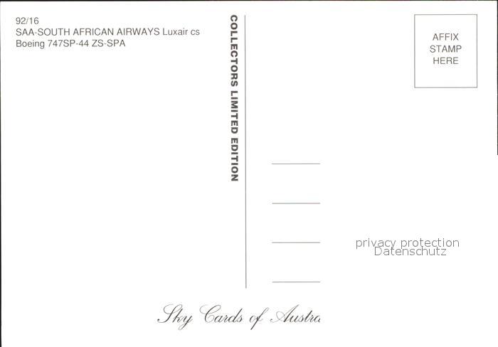 Flugzeuge Zivil SAA-South African Airways Luxair cs Boeing 747SO-44 ZS-SPA postalisch nicht gelaufen Erhaltung siehe scans