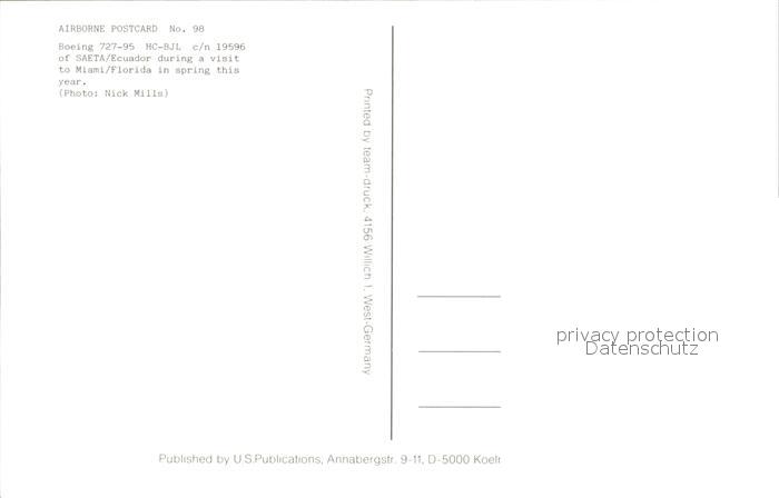 Flugzeuge Zivil Saeta Ecuador Boeing 727-95 HC-BJL c/n 19596 postalisch nicht gelaufen Erhaltung siehe scans