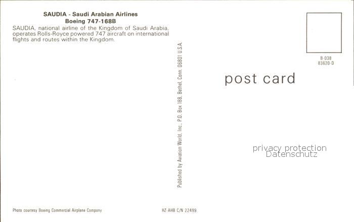 Flugzeuge Zivil SAUDIA Boeing 747-168B postalisch nicht gelaufen Erhaltung siehe scans