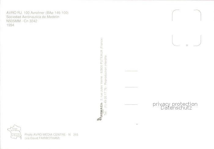 Flugzeuge Zivil SCM Colombia AVRO RJ 100 Avroleiner BAe 146-100 N505MM cn 3242 postalisch nicht gelaufen Erhaltung siehe scans