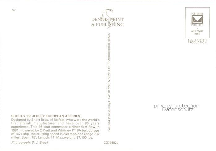 Flugzeuge Zivil Shorts 360 Jersey European Airlines postalisch nicht gelaufen Erhaltung siehe scans