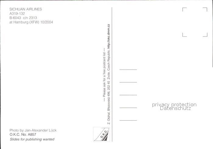 Flugzeuge Zivil Sichuan Airlines A319-132 B-6043 c/n 2313 postalisch nicht gelaufen Erhaltung siehe scans