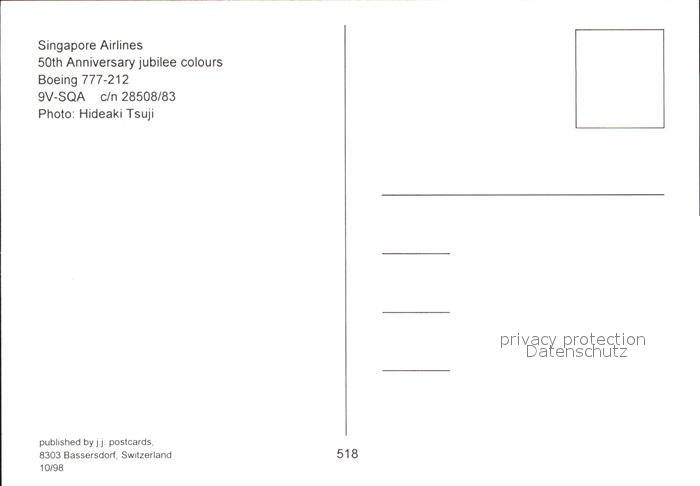 Flugzeuge Zivil Singapore Airlines 50th Anniversary Boeing 777-212 9V-SQA c/n 28508/83 postalisch nicht gelaufen Erhaltung siehe scans