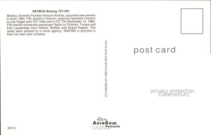 Flugzeuge Zivil Skybus Boeing 727-291 N407BN postalisch nicht gelaufen Erhaltung siehe scans