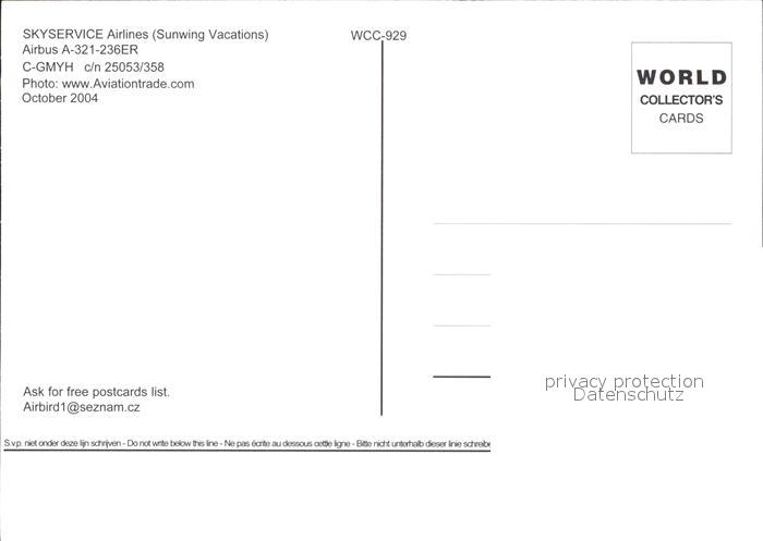 Flugzeuge Zivil Skyservice Airlines Sunwing Vacations Airbus A-321-236ER C-GMYH postalisch nicht gelaufen Erhaltung siehe scans