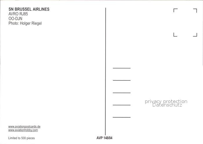 Flugzeuge Zivil SN Brussel Airlines AVRO RJ85 OO-DJN postalisch nicht gelaufen Erhaltung siehe scans